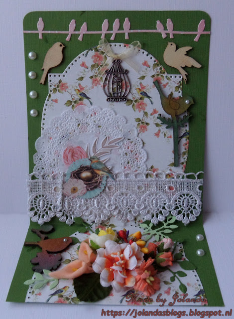 Op het designpapier heb ik een leuke doily en kant geplakt en daarop het plaatje van het vogeltje.
